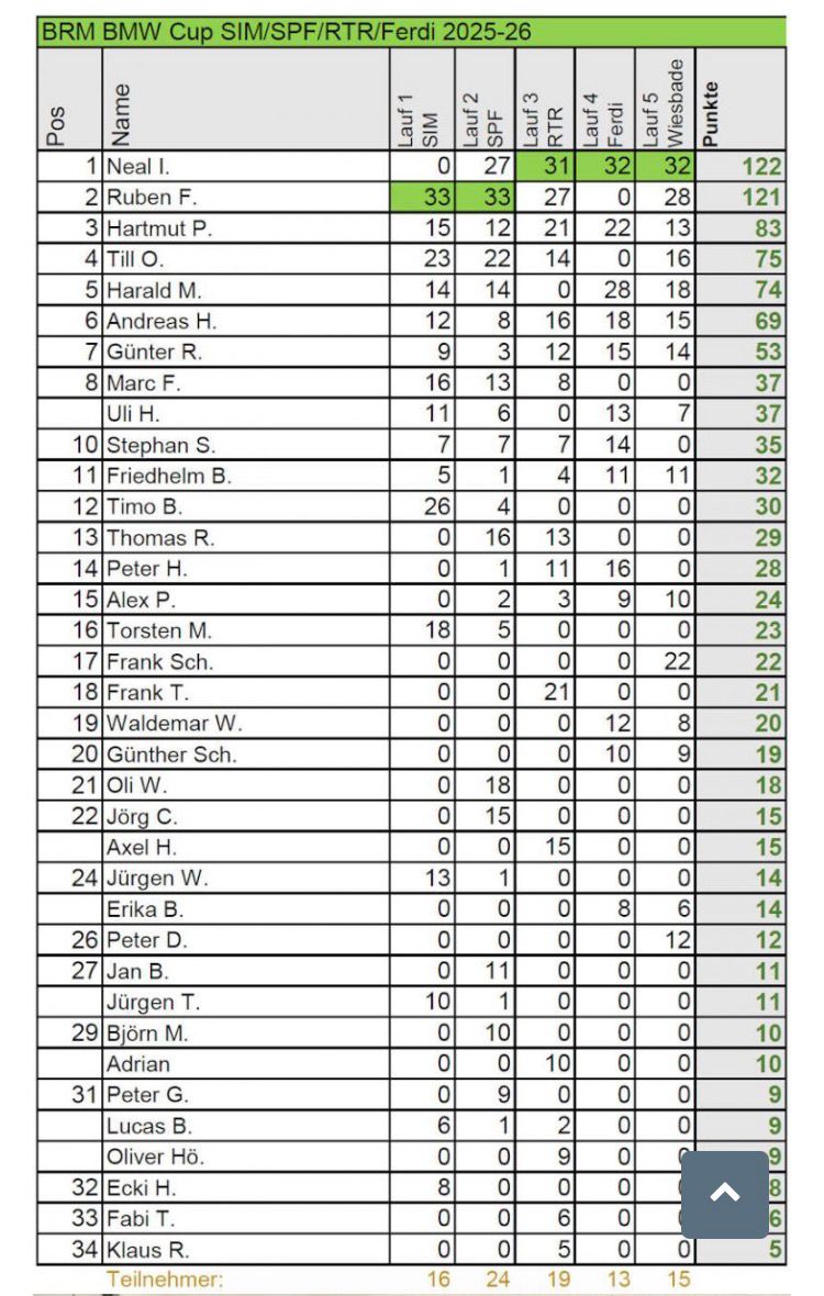 | 10 | Friedhelm B. | 9,094 | 36,00 | 36,00 | 35,00 | 37,78 | 35,00 | 179,78 |