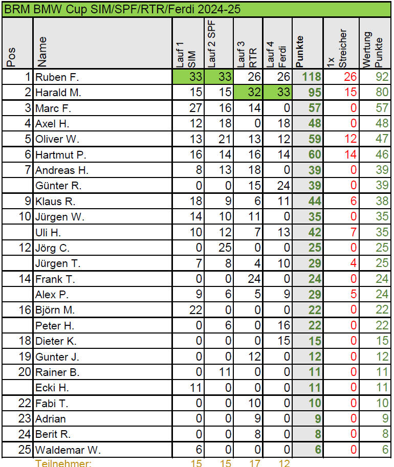 | Fahrer | Quali | Spur 1 | Spur 2 | Spur 3 | Spur 4 | Spur 5 | Spur 6 | Gesamt |